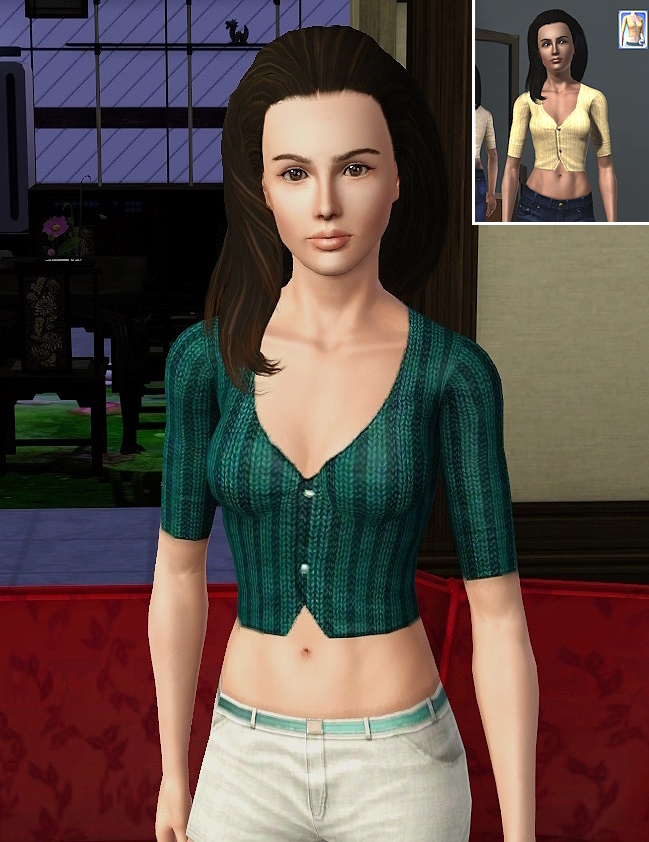 Feb. 24th, 2024 03:42 pmYet another EA creation taken apart. I hated the fact the lovely sweater/cardigan had been thrown over a stupid shirt, when it all by itself would've been perfect. So, I trew the shirt into a trashbin were it belongs. I really like how the sweater looks and it also recolors nicely. I also turned the buttons recolorable, so there are 2 recolorable channels. Available in everyday and formal categories, not valid for random. The original top is from the Outdoor Living SP but I used the base game bikini top as a base, so base game should be enough.